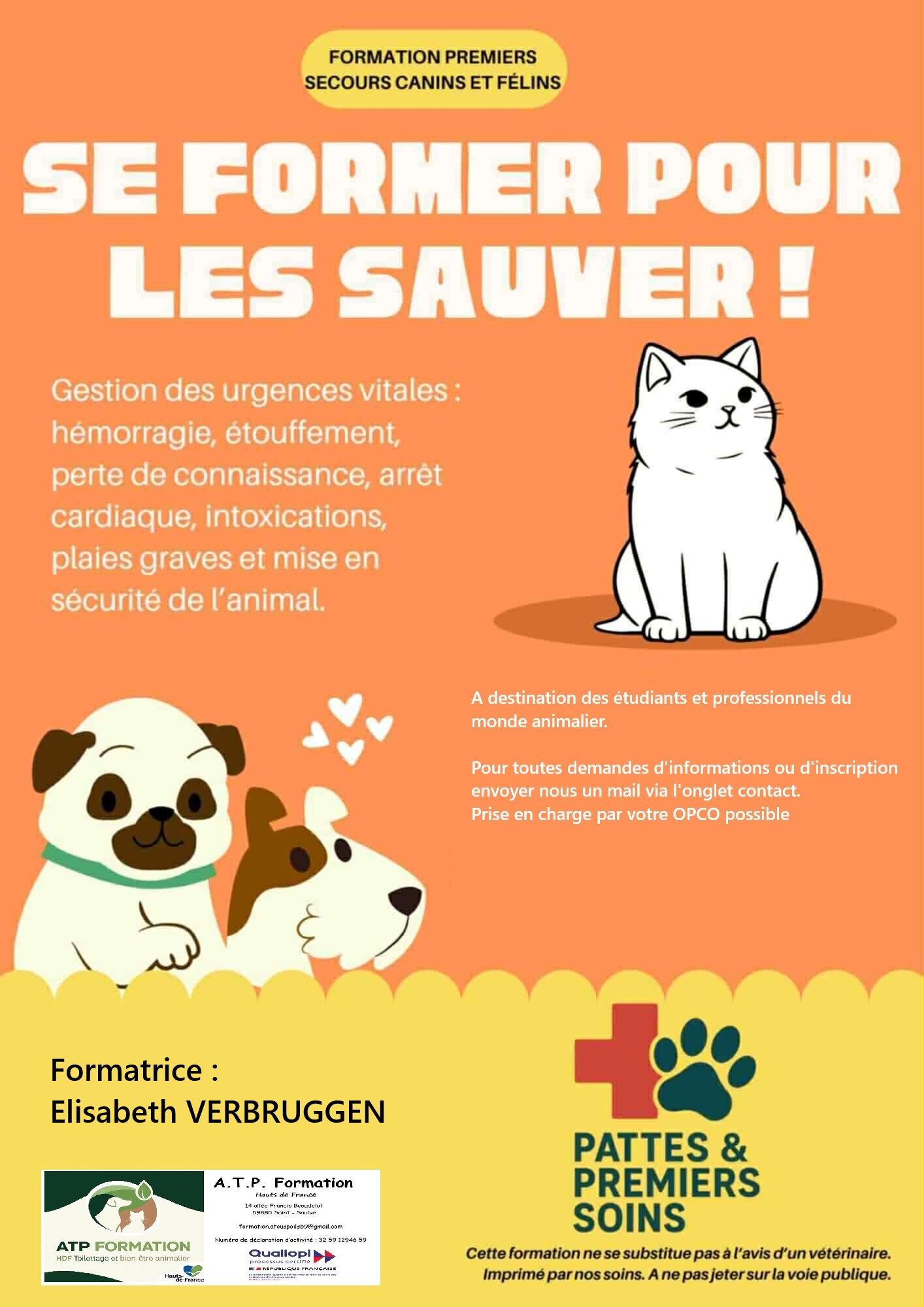 Élisabeth Verbruggen, formatrice en premiers secours humains, canins et félins, met son expertise au service de la prévention et de la sécurité. Forte d’une expérience confirmée en formation SST et d’une spécialisation dans les premiers secours animaliers, elle accompagne professionnels avec des méthodes pédagogiques actives, accessibles et conformes aux exigences réglementaires. Son approche est centrée sur la pratique, l’adaptation aux publics et la qualité des apprentissages.